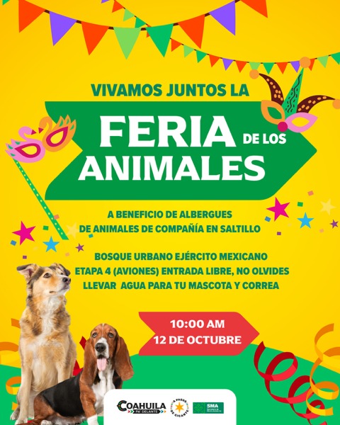 Saltillo, Coahuila de Zaragoza.– El Gobierno del Estado de Coahuila de Zaragoza, a través de la Secretaría de Medio Ambiente, invita a todas las familias coahuilenses a participar en la Feria de los Animales, que se llevará a cabo el domingo 12 de octubre de 2025 en el Bosque Urbano Ejército Mexicano, Etapa 4 (Aviones), en Saltillo, a partir de las 10:00 de la mañana; así como en las Carreras Perronas que se efectuarán de manera simultanea en 8 municipios.