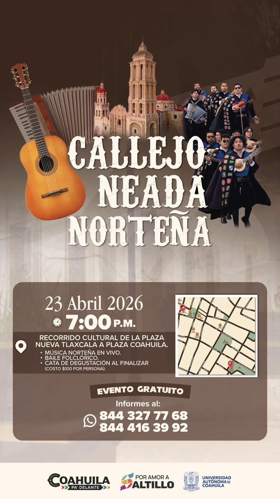 Saltillo, Coahuila de Zaragoza.- El Gobierno Municipal que encabeza el alcalde Javier Díaz González invita a las familias saltillenses a disfrutar de la Callejoneada Norteña en el Centro Histórico de la ciudad.
