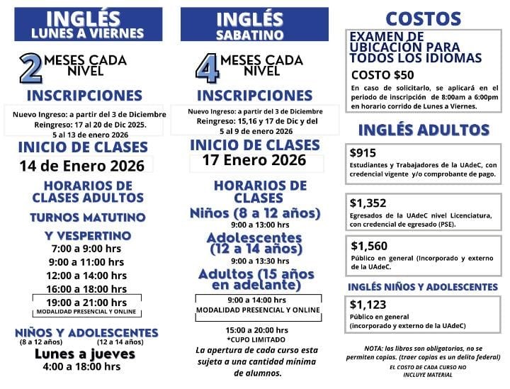 Se dará inicio con el Curso de Inglés Nivel 1 en modalidad presencial de lunes a viernes en un horario de 4:00 a 6:00 de la tarde en las instalaciones de la Facultad de Ciencias Biológicas, tendrá una duración de dos meses, con un costo para alumnos y trabajadores de la UAdeC de $915 pesos y para el público en general $1,560 pesos.