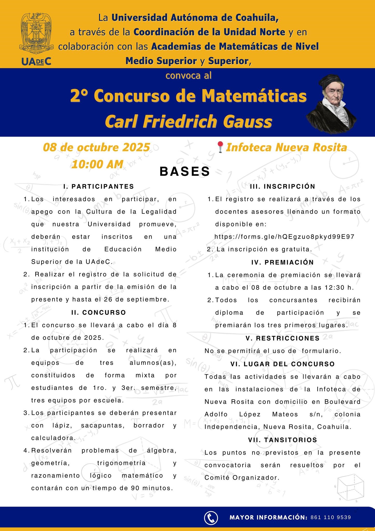 NUEVA ROSITA, Coahuila. La Universidad Autónoma de Coahuila, a través de la Coordinación de Unidad Norte, en colaboración con las Academias de Matemáticas de Nivel Medio Superior y Superior, convocan al 2° Concurso de Matemáticas “Carl Friedrich Gauss”, que se llevará a cabo el 8 de octubre de 2025 en la Infoteca de Nueva Rosita, Coahuila.