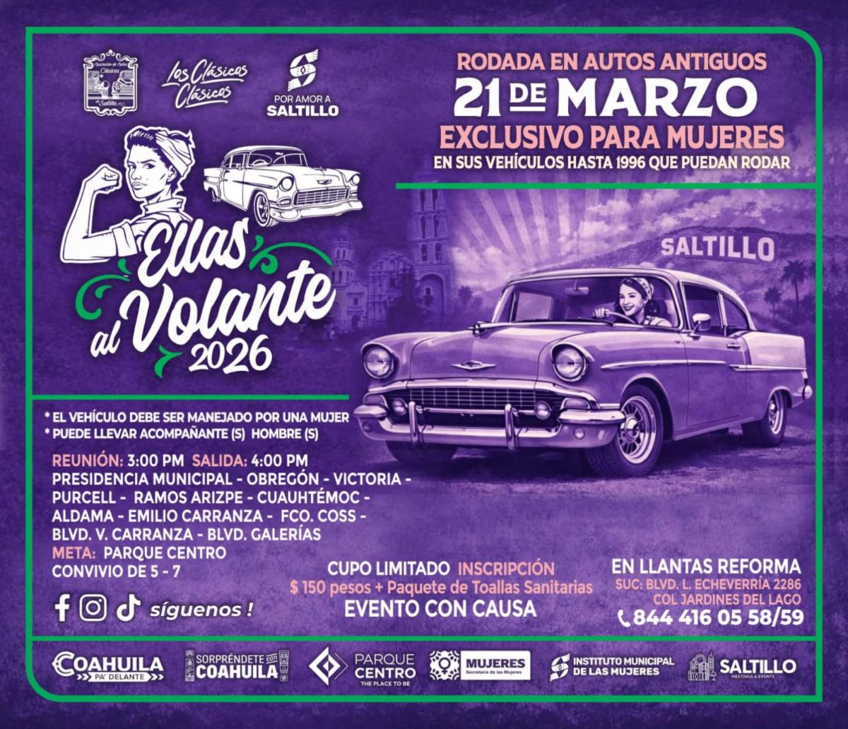 Saltillo, Coahuila de Zaragoza.- El Gobierno Municipal, a través del Instituto Municipal de las Mujeres, en coordinación con la Secretaría de las Mujeres del Gobierno del Estado y la Asociación de Autos Clásicos de Saltillo, A. C., invitan a la Rodada en Autos Antiguos “Ellas al Volante” en su edición 2026, que se desarrollará el próximo sábado 21 de marzo.