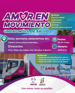 En este sentido, informó que a través del programa Amor en Movimiento, la unidad del DIF municipal llegará a la colonia Morelos V Sector a partir de las 4:00 de la tarde, en el centro comunitario ubicado en la prolongación Otilio González.